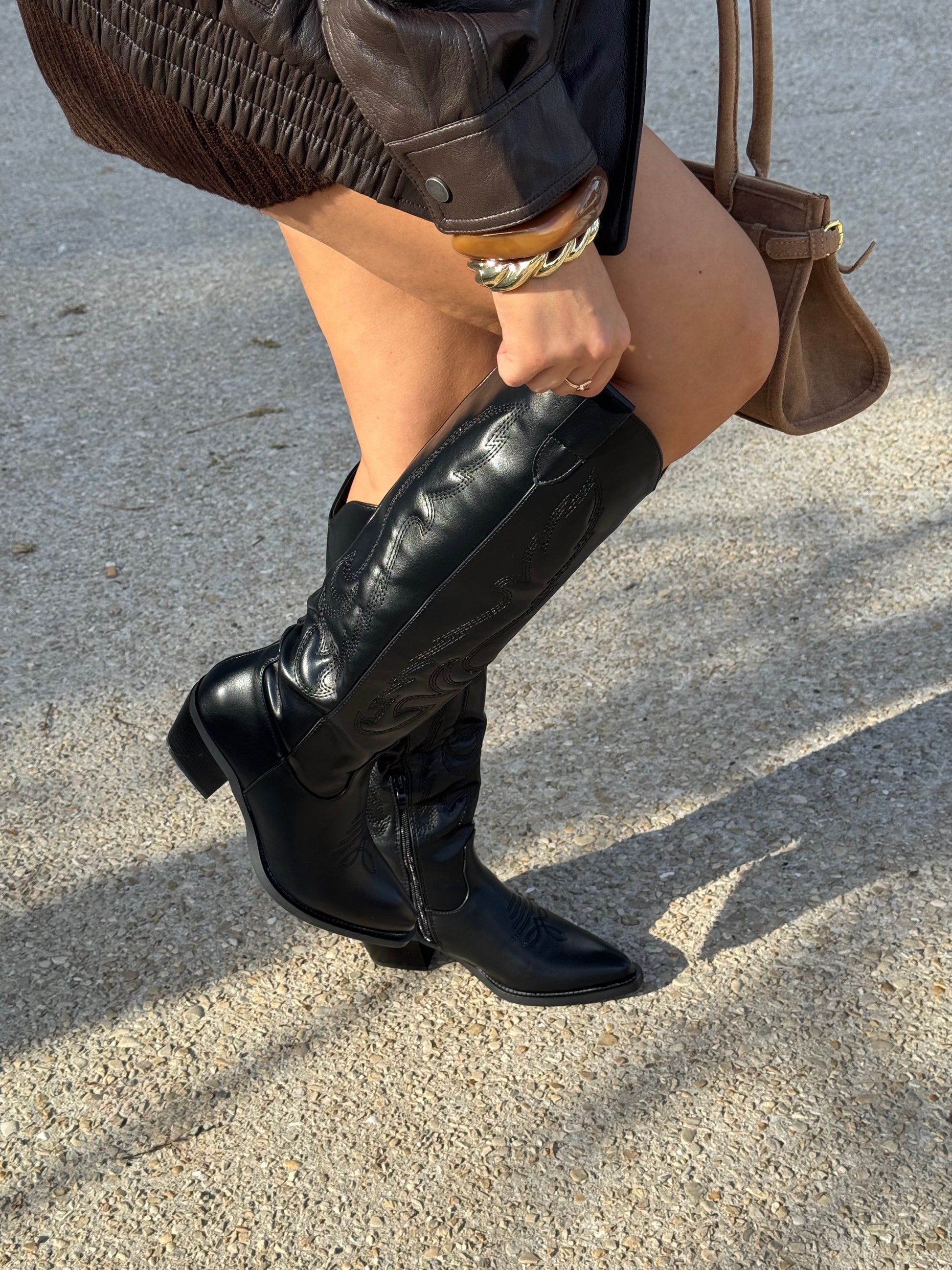 Craquez pour ces santiags en similicuir noir, le modèle parfait pour ajouter une touche western-chic à vos looks du quotidien. Avec leur bout pointu et leur petit talon typique de 2 cm, elles allongent la silhouette tout en restant très confortables à porter.